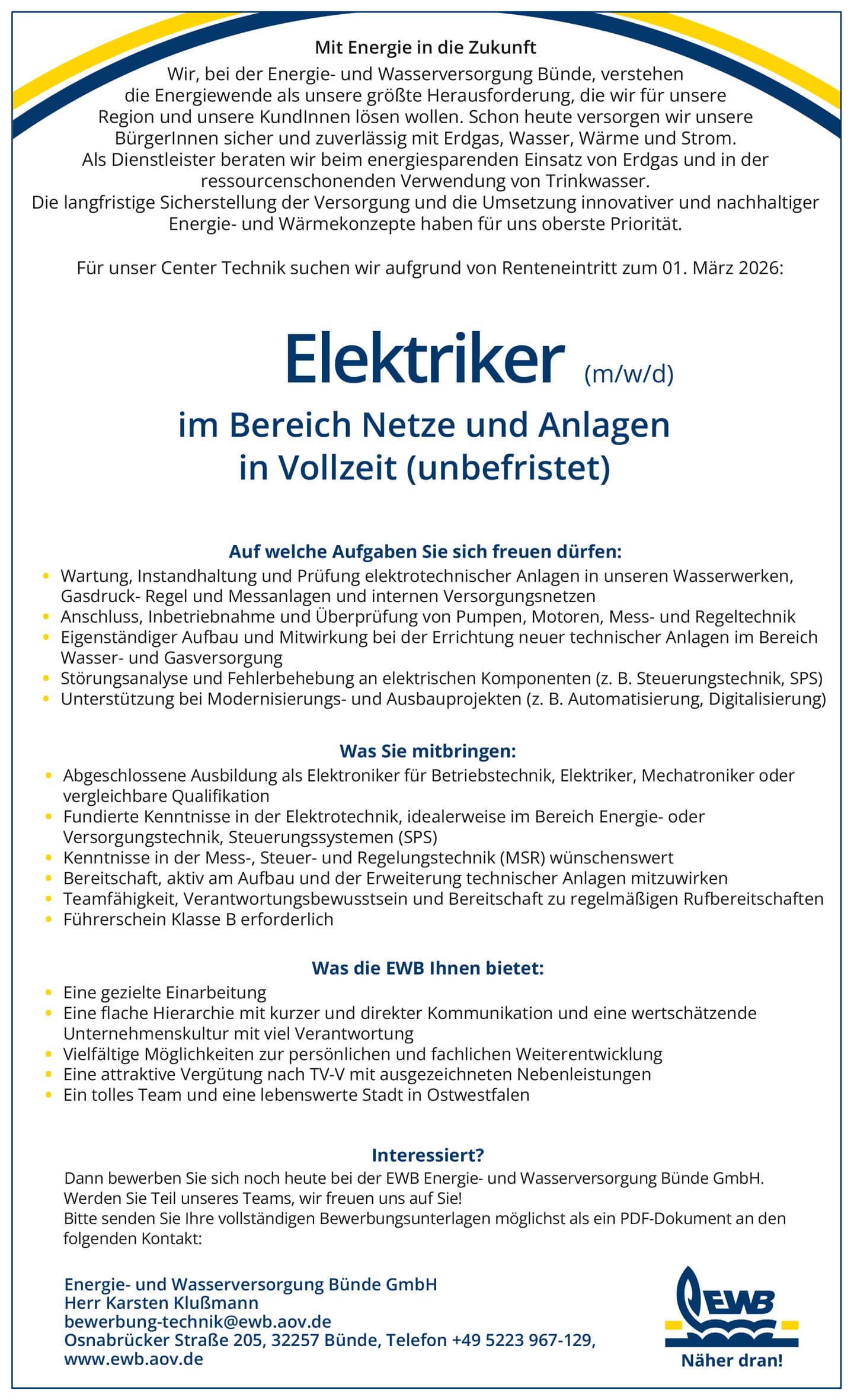 Hier finden Sie aktuelle Stellenangebote und Informationen über Ausbildungsmöglichkeiten bei der EWB.