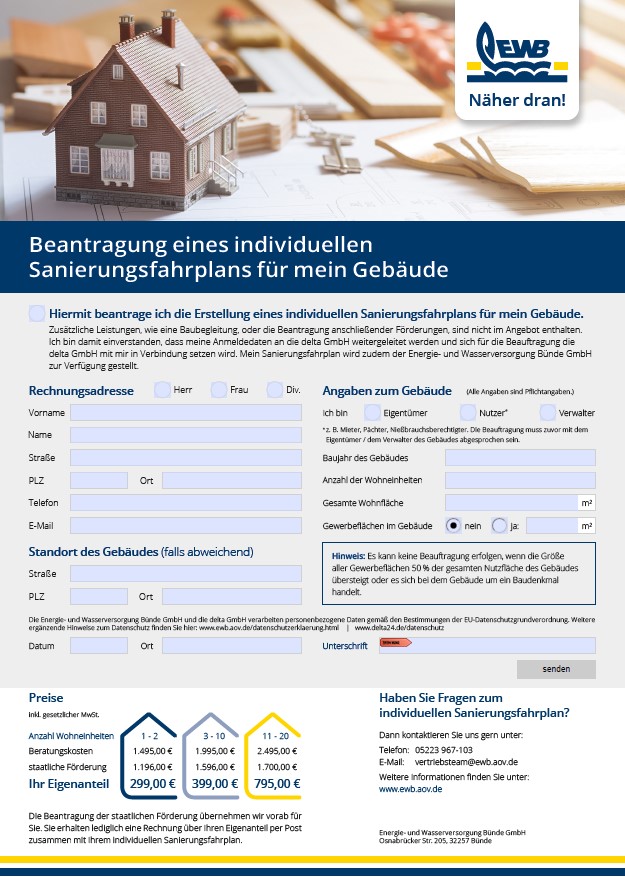 Die 50%ige Förderung kann durch unseren Dienstleister, der Energieberatung Enerharve, beantragt werden. Erst nach Bewilligung der Förderung durch die BAFA wird der individuelle Sanierungsfahrplan erstellt.